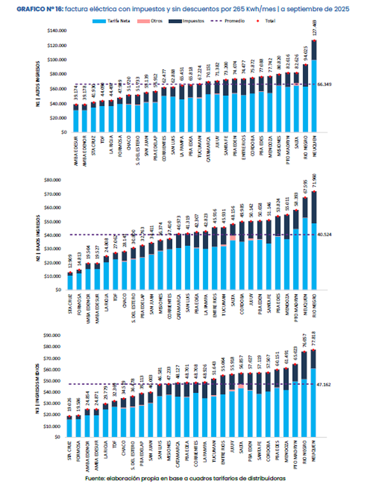 La estructura de tarifas de servicios públicos en Argentina presenta una notable dispersión. En septiembre de 2025, la factura eléctrica promedio a nivel nacional para un hogar de altos ingresos (N1) es de $66.349, mientras que para ingresos bajos (N2) es de $40.524 y para ingresos medios (N3) de $47.162. En el caso del gas, los promedios nacionales son de $44.905 (N1), $30.981 (N2) y $33.849 (N3). Sin embargo, estos valores ocultan -según el «Reporte de Tarifas y Subsidios #30″, correspondiente a septiembre de 2025, elaborado por el Observatorio de Tarifas y Subsidios del IIEP (UBA-CONICET)- las profundas diferencias que existen entre las distintas jurisdicciones del país.